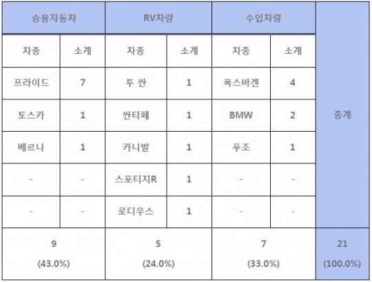 ƯÈ÷ ±¹³»¡¤¿Ü ½Â¿ëÀÚµ¿Â÷ 16°Ç Áß¿¡´Â »ó´ëÀûÀ¸·Î ´Ù¸¥ Â÷Á¾ º¸´Ù µðÁ© Â÷·® °ø±Þ ºñÁßÀÌ ³ô¾Ò´ø ƯÁ¤ ÀÚµ¿Â÷°¡ 11°Ç(52.0%)À¸·Î È¥À¯ »ç°í ºñÁßÀÌ »ó´çÈ÷ ³ô°Ô ³ªÅ¸³².